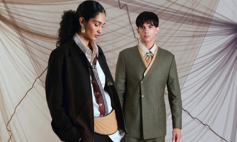 A large structured design beside loose garments creates contrast,while a smaller bag introduces a lighter visual impression.